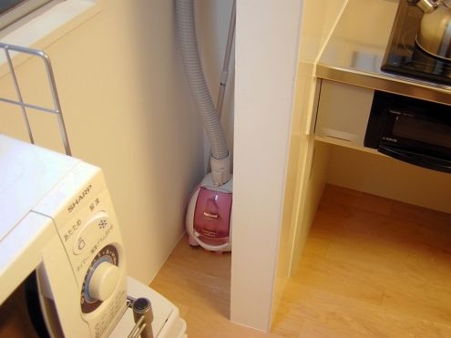コンロ脇の目隠しされた スペースに掃除機。リビングに共用の掃除機があるのは便利なのですが、むき出しで置いてあるのはちょっとアレではありますので、これは良いのではないでしょうか。