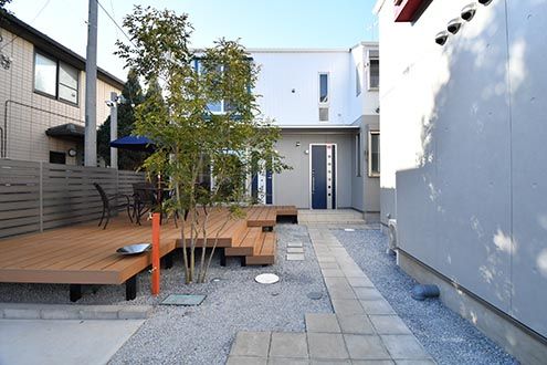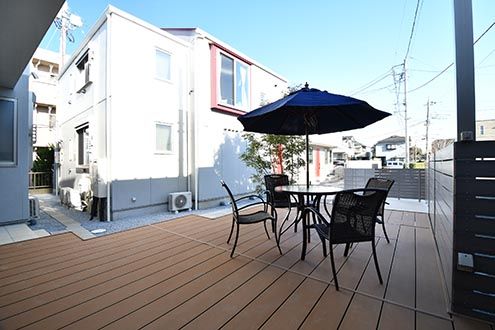 大きな窓の外には、ウッドデッキのテラス。