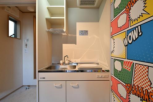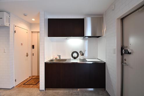 ワンルーム型の室内には、ミニキッチンと水まわり設備が用意されています。