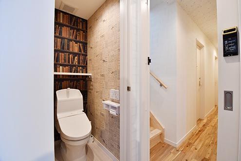 背面には本棚の壁紙。トイレはウォシュレット付き。