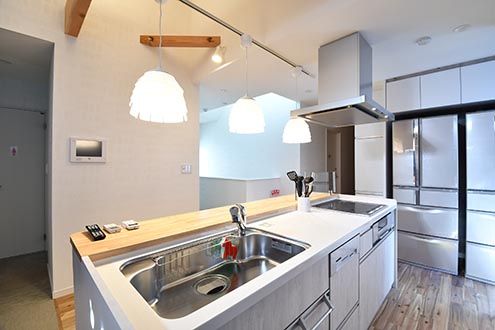 キッチンには、シンクと3口のIHクッキングヒーターが設置されています。