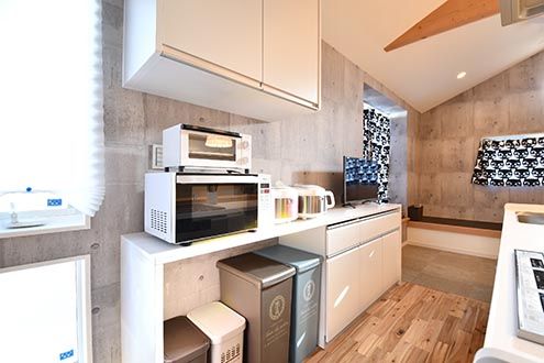Acqua棟と同じようにキッチン家電も設置されています。疲れている日は、お弁当をレンジで温めて食事をとることもできます。