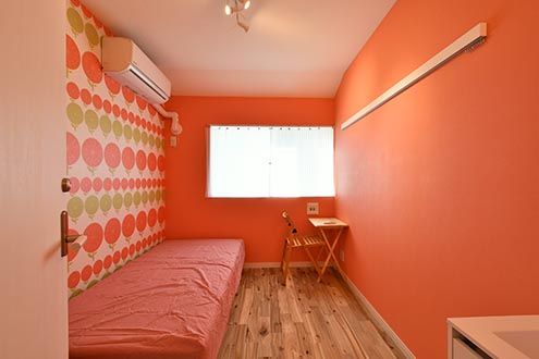 室内は、眩しいくらい鮮やかなオレンジ色の壁紙。