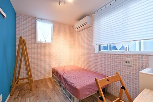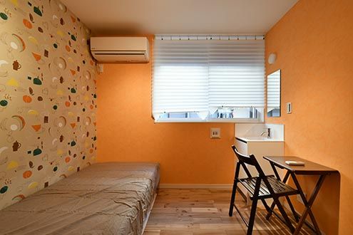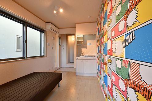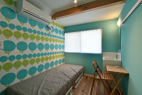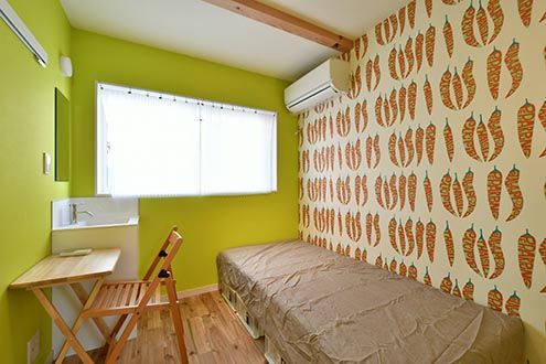 どの専有部も原色をベースに、印象的な壁紙で構成されています。それだけだと落ち着かないかもしれませんが、床のシンプルな無垢材との塩梅が、適度に居心地を良くしてくれそうです。