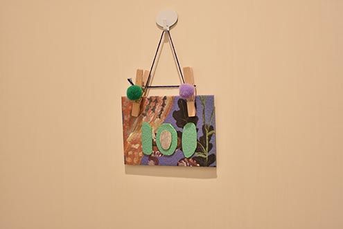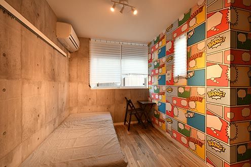 コンクリートの打ちっぱなしをベースに、特徴的な絵画のような壁紙。