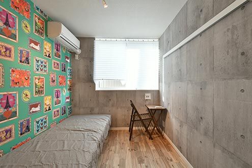 むき出しのコンクリートをベースに、やはり特徴的な壁紙。淡い色合いが穏やかな印象を与えます。