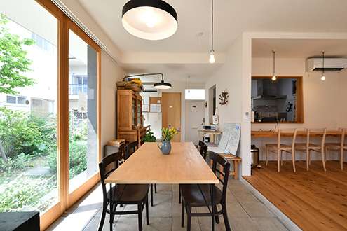 奥の方は、窓の外のグリーンが良い按配で効いているダイニング。