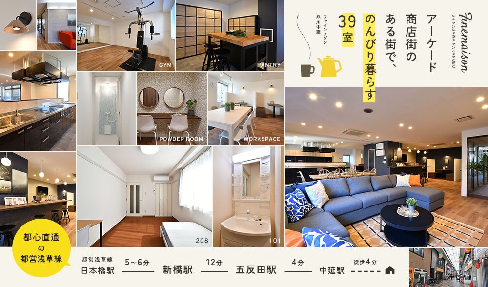 都営浅草線で五反田駅から4分の位置にある中延駅から徒歩4分。中規模ながら、「ファインメゾン 品川中延」は共用部にラウンジ、ワークスペース、ジム、パウダールームを備えます。居心地の良い落ち着いたラウンジに目を奪われますが、16.2㎡の広めの空間に大きな洗面台まで備える専有部も大きな魅力。全体のバランス